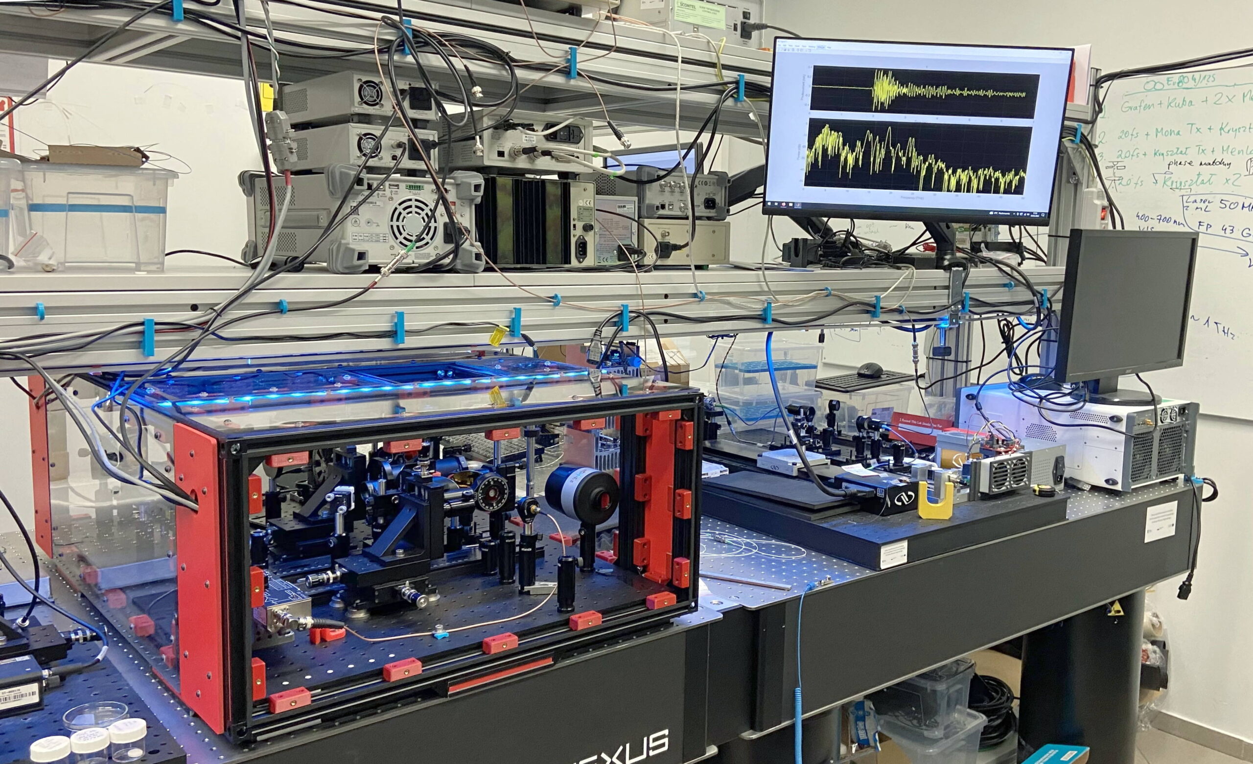 Ł.S.: Myślę, że to zaczęło się wraz z wynalezieniem laserów impulsowych, czyli takich źródeł światła, które zamiast wytwarzać światło fali ciągłej, wytwarzają wysokoenergetyczne impulsy. W latach osiemdziesiątych taki pan Oston wynalazł fotoprzełącznik. To jest takie urządzenie, które potrafi przełączać prąd w bardzo krótkim czasie rzędu pikosekund i nawet krótszym. To jest dziesięć do minus dwunastej sekundy. To jest jeden milion na milion. Ta skala czasowa pozwala wytwarzać te impulsy. I wtedy zaczął się prawdziwy boom. Może nie od razu, nabierało to rozpędu. W okolicach lat dwutysięcznych pojawił się duży wysyp grup terahercowych. Natomiast gdzieś to się w pewnym momencie zatrzymało, rozwiązania technologiczne spotkały się w pewnym punkcie i dalej nie ma takiego demokratycznego rozwiązania, takiego „teraherce dla mas”. Są już pierwsze próby wytworzenia masowych urządzeń, emiterów i detektorów, ale monochromatycznych, na jednym kolorze, które są niestety słabo przystrajalne. A te cele, o których wspomniałem, czyli czy analiza dzieł sztuki, czy wykrywanie fałszerstw leków, czy badania jakichś minerałów na Marsie lub innych planetach wymagają zastosowania szerokopasmowych rozwiązań, a takich nie ma.