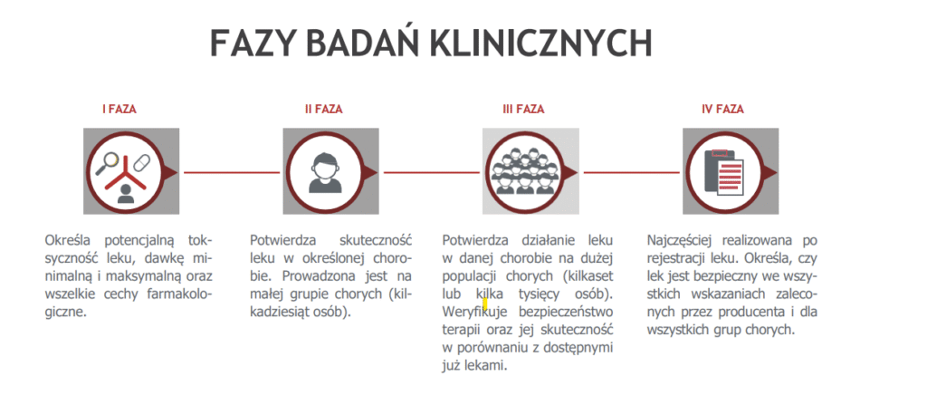 E.B.: Tak, od pomysłu. Czyli mamy pewną ideę, pomysł. I najbardziej obrazowo to wygląda tak, że naukowcy identyfikują powiedzmy jakiś cel biologiczny, na przykład białko, które powoduje jakąś chorobę. I wtedy mamy zidentyfikowany cel i wtedy staramy się znaleźć substancję, cząsteczkę, która w jakiś sposób będzie wpływać na ten nasz, ogólnie mówiąc, cel. Czyli na to… Będzie zmieniać w jakiś sposób to białko, powiedzmy. I w laboratorium analizuje się naprawdę dziesiątki tysięcy cząsteczek. Oczywiście tak naprawdę większość, powyżej 90% tych cząsteczek, po prostu nie przechodzi do dalszych badań. Później mówimy o badaniach przedklinicznych, czyli badaniach na modelach komórkowych, później badaniach na zwierzętach i dopiero w momencie, kiedy te wyniki są na tyle optymistyczne, to znaczy na tyle bezpieczne i widzimy pewien potencjał skuteczności danej cząsteczki, to wtedy zaczynamy prowadzić badania z udziałem ludzi i to są właśnie badania kliniczne. Jeżeli mówimy o badaniach z udziałem ludzi, to oczywiście mamy, tak jak pani słusznie zauważyła, mamy cztery fazy badań. Pierwsza to jest oczywiście badanie pierwszej fazy. W czasie tej fazy badamy przede wszystkim bezpieczeństwo i możemy tutaj już oceniać dawkę, czyli oceniamy, jaka dawka będzie jednocześnie bezpieczna i skuteczna. Druga faza to jest głównie po to, aby potwierdzić skuteczność. I tutaj w pierwszej bezpieczeństwo, czyli mamy lek bezpieczny. Druga faza: oceniamy skuteczność, czyli osiągamy ten założony cel, czyli cząsteczka jest skuteczna. I trzecia faza to jest: porównujemy, czy ta nowa cząsteczka jest lepsza od standardowego leczenia, jeżeli oczywiście takie mamy. Ta trzecia faza też jest nazywana fazą rejestracyjną, dlatego że po zakończeniu trzeciej fazy badania klinicznego możemy złożyć wniosek do odpowiednich urzędów o to, żeby ta cząsteczka została zarejestrowana. I wprowadzamy cząsteczkę do obrotu i wtedy już możemy nazywać ją lekiem. I mamy jeszcze czwartą fazę, fazę porejestracyjną, gdzie badamy już lek na szerszej populacji, w takim ogólnym dostępie. Tak że takie są etapy. Tak jak powiedziałam, droga jest bardzo długa i bardzo złożona. Ten cały proces od pomysłu do rejestracji może trwać między 10 a 15 lat. Także to jest naprawdę bardzo długi proces i bardzo, bardzo złożony.